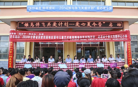 启动仪式上,张俊宗为大沟镇中心小学授牌“甘肃省中小学美育课程试点学校”,中国青年报社为大沟镇中心小学捐赠图书3000余册、教具200余套,建立了“雏鸟伴飞爱心图书馆”。张俊宗在讲话中说,西北师大是一所以拓荒教育为特色的百年老校,特别是西迁兰州以来,以发展甘肃及西北教育事业为己任,在致力于培养一批批人民教师的同时,广泛深入的开展了丰富多彩的教育服务活动。在新的伟大时代,为积极响应党中央关于加强中小学美育教育的号召,服务精准扶贫事业,培育了“爱在远山”全省贫困地区艺术教育精准扶贫活动,在会宁、东乡、积石山等五个深度贫困地区同时开展活动,旨在把美的精神、美的向往,根植于孩子们的心灵深处,为他们对美好生活的向往插上放飞的翅膀。活动受到了省委、省政府的高度重视,得到了社会各界的高度关注,对助推正在进行的精准扶贫伟大事业和乡村振兴伟大战略产生了重要的影响。